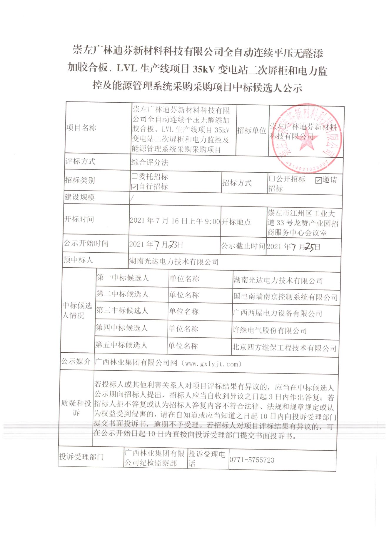 崇左廣林迪芬新材料科技有限公司年產(chǎn)21萬m3全自動連續(xù)平壓無醛添加膠合板、LVL生產(chǎn)線項(xiàng)目35KV變電站二次屏柜和電力監(jiān)控及能源管理系統(tǒng)采購項(xiàng)目中標(biāo)候選人公示